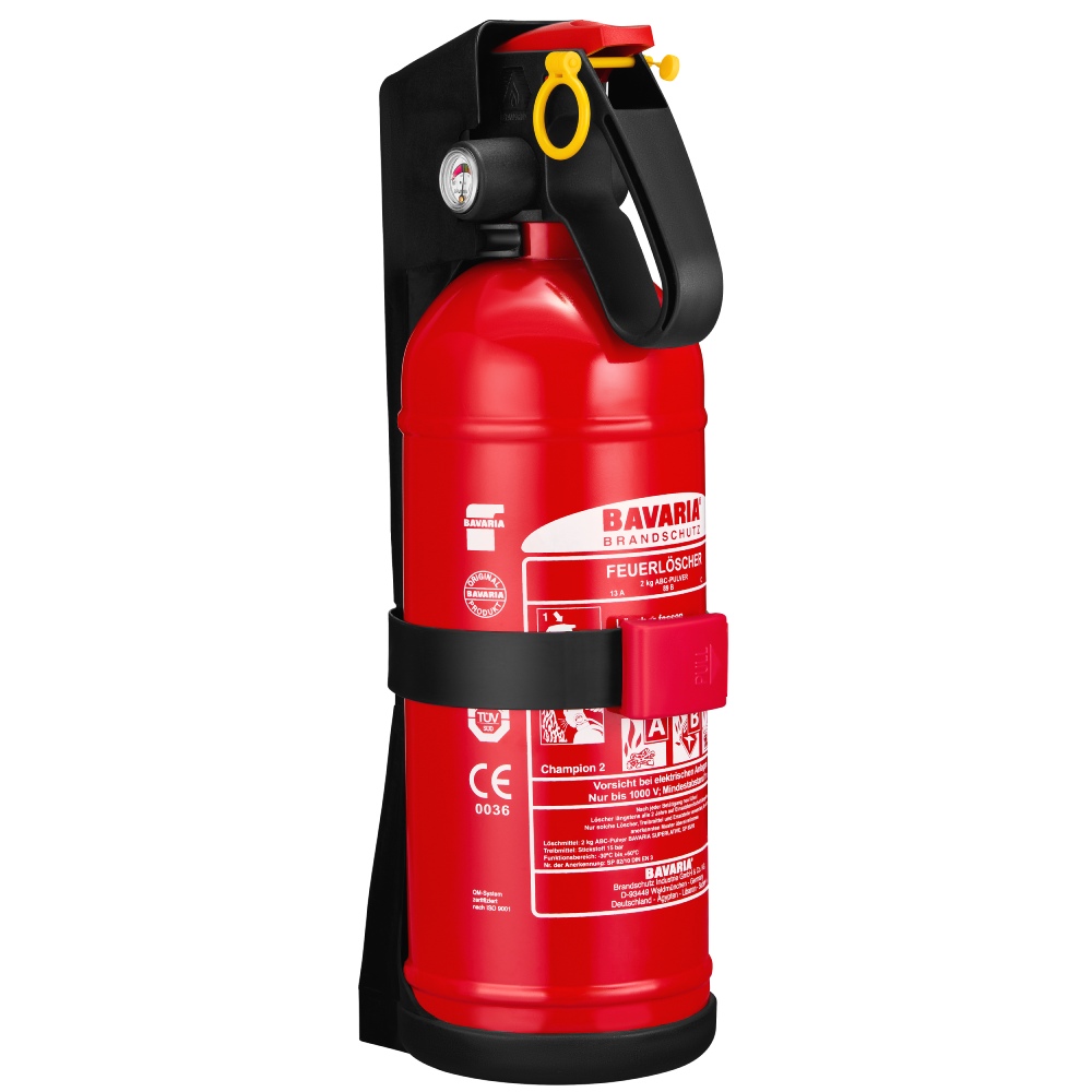 Portable powder fire extinguisher, 2 kg, ideal for household and vehicle use.