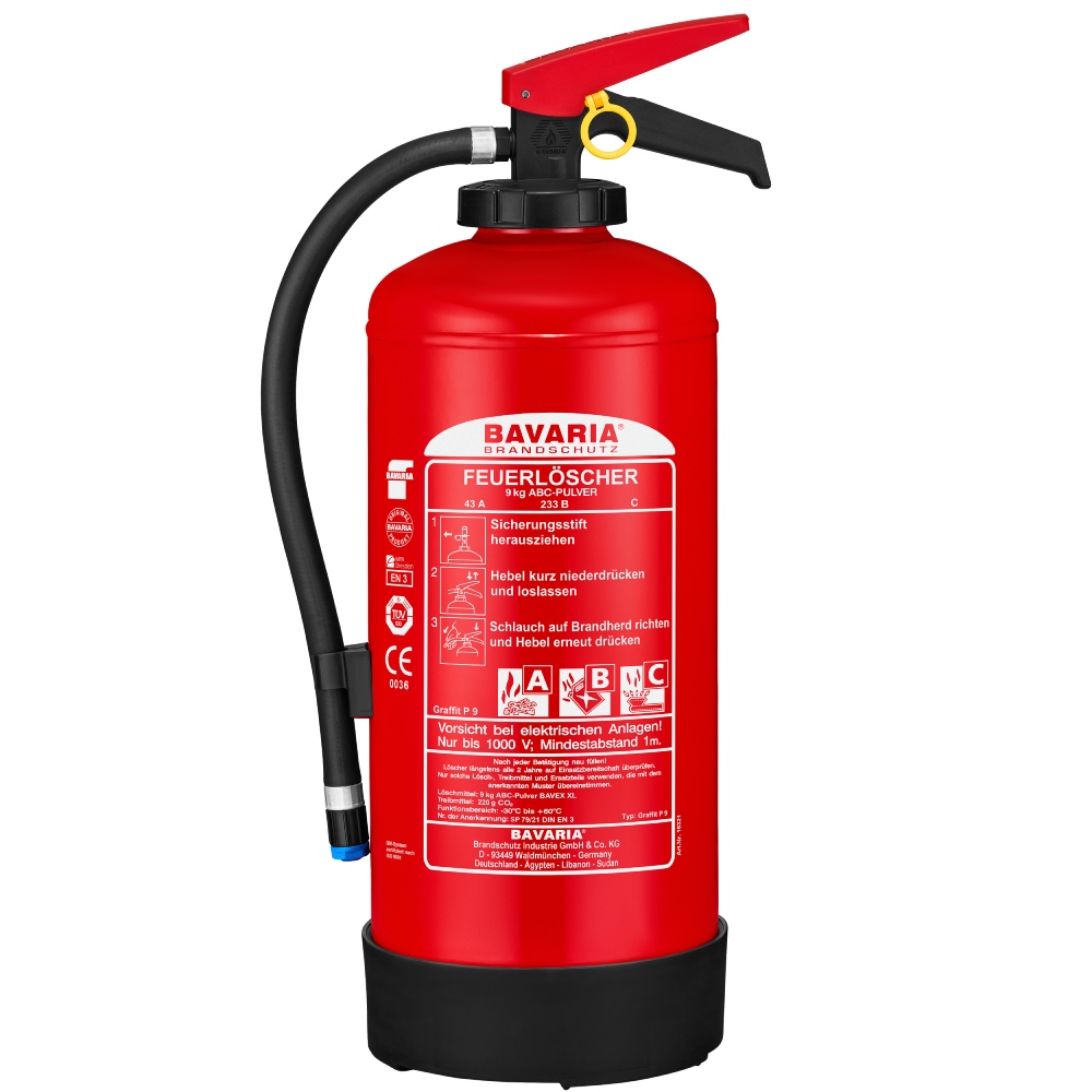 Powder fire extinguisher, 9 kg, ideal for workshops and storage areas.